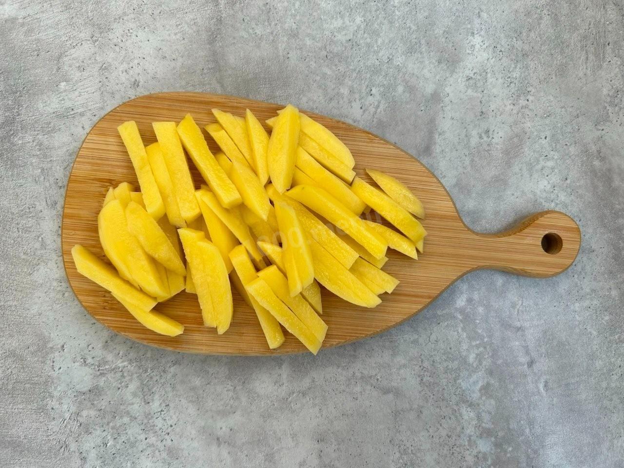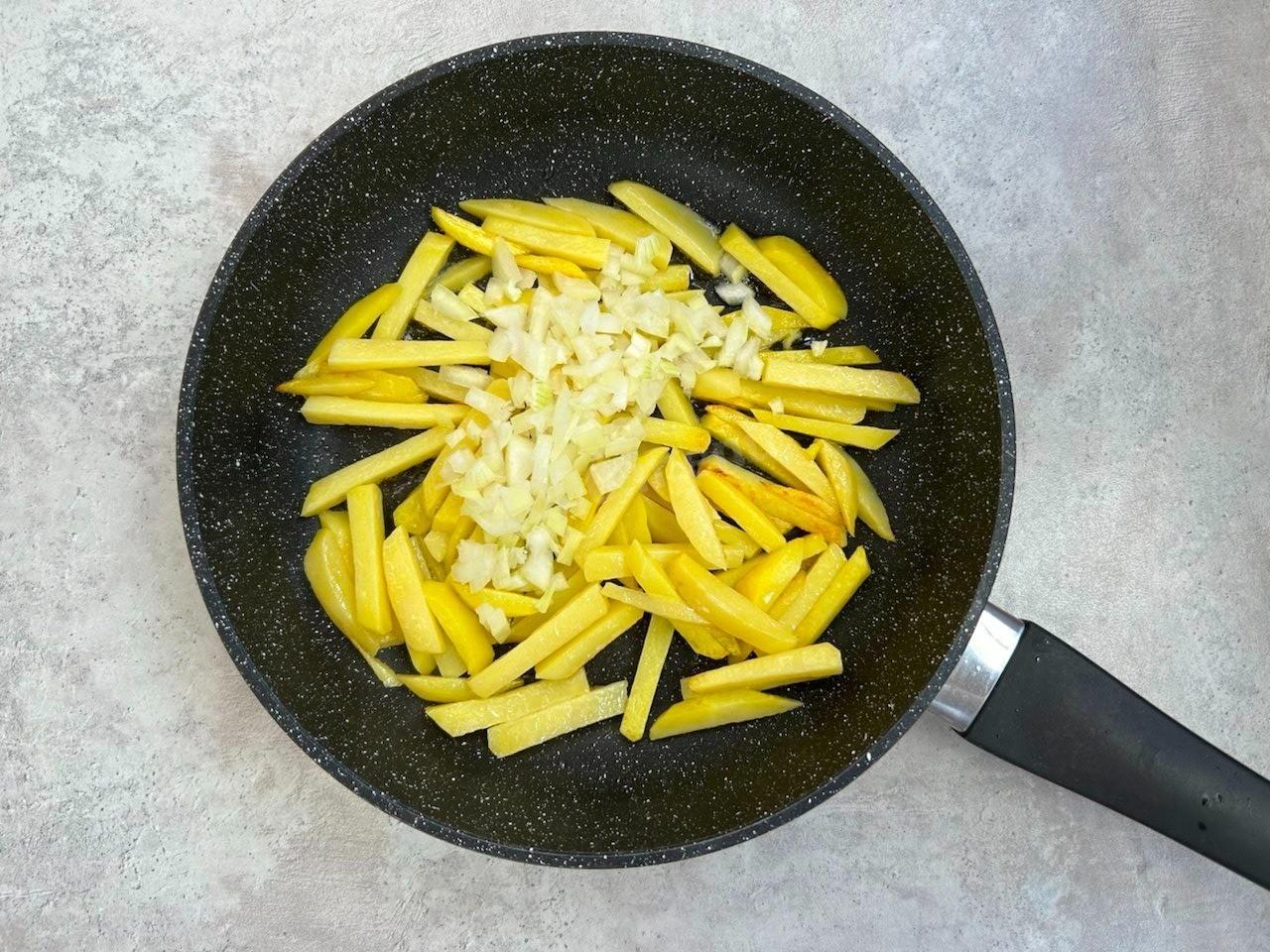 Очистите лук и картофель. Нарежьте картофель соломкой.