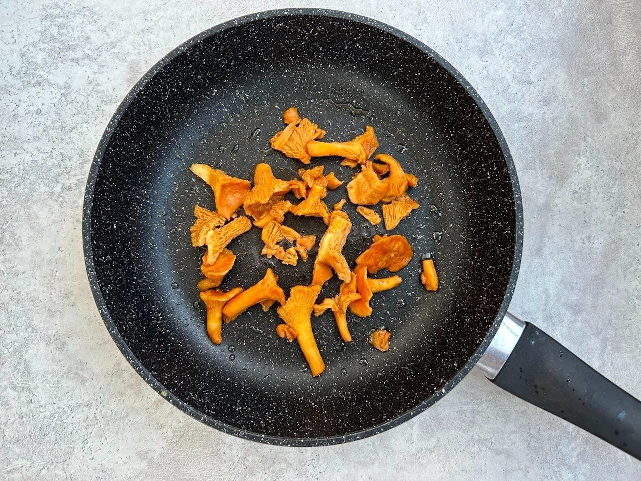 Влейте в сковороду ещё немного масла, выложите на него лисички и также обжарьте, помешивая, в течение 5-7 минут.