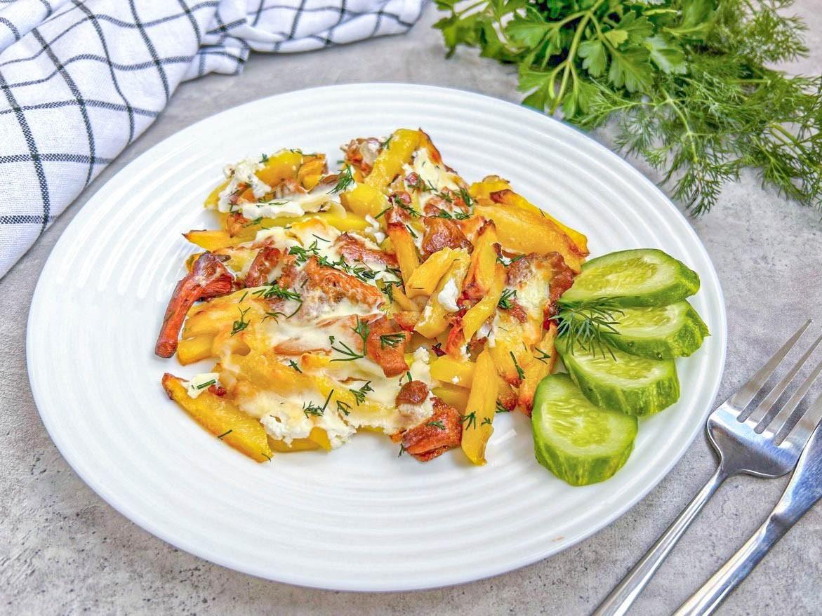 Прежде чем выложить картошку и грибы на противень, соединила из на сковороде и перемешала.