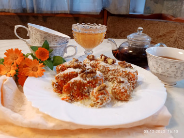 После того, как морковь стала мягкой и сок испарился, смешала с печеньем и измельчёнными орехами.