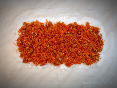 Далее морковь с кокосовой стружкой скрутить в ролл и убрать в холодильник на 1 час.
