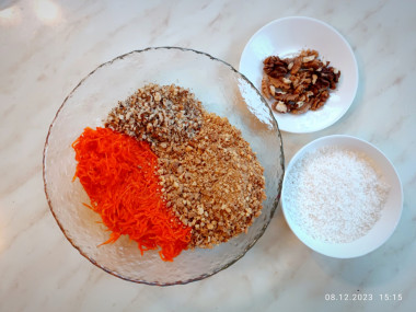 К моркови добавить перемолотые в крошку печенье и грецкие орехи. Тщательно все перемешать и убрать в холодильник.
