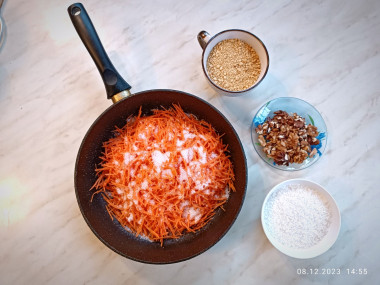 Морковь натереть на крупной терке, должно получиться 3 стакана. Натертую морковь выложить на сухую сковороду.