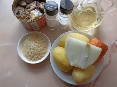 Калорийность продуктов: Сайра консервированная, Картошка, Лук, Морковь, Рис, Вода, Растительное масло, Соль, Специи сухие