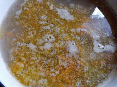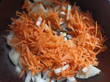 На горячую сковороду налейте немного растительного масла и выложите измельченные морковь с луком. Обжарьте 2-3 минуты на среднем огне. Помешивайте, чтобы овощи не начали подгорать. Затем готовую зажарку отправьте в кастрюлю с супом.