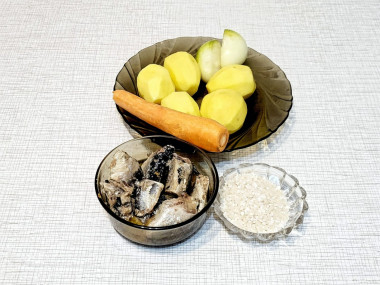Как сделать рыбный суп из консервов с рисом? Подготовьте для этого необходимые ингредиенты. Такой суп можно готовить из консервированной сайры, сельди, горбуши или сардинеллы. Я беру сайру.