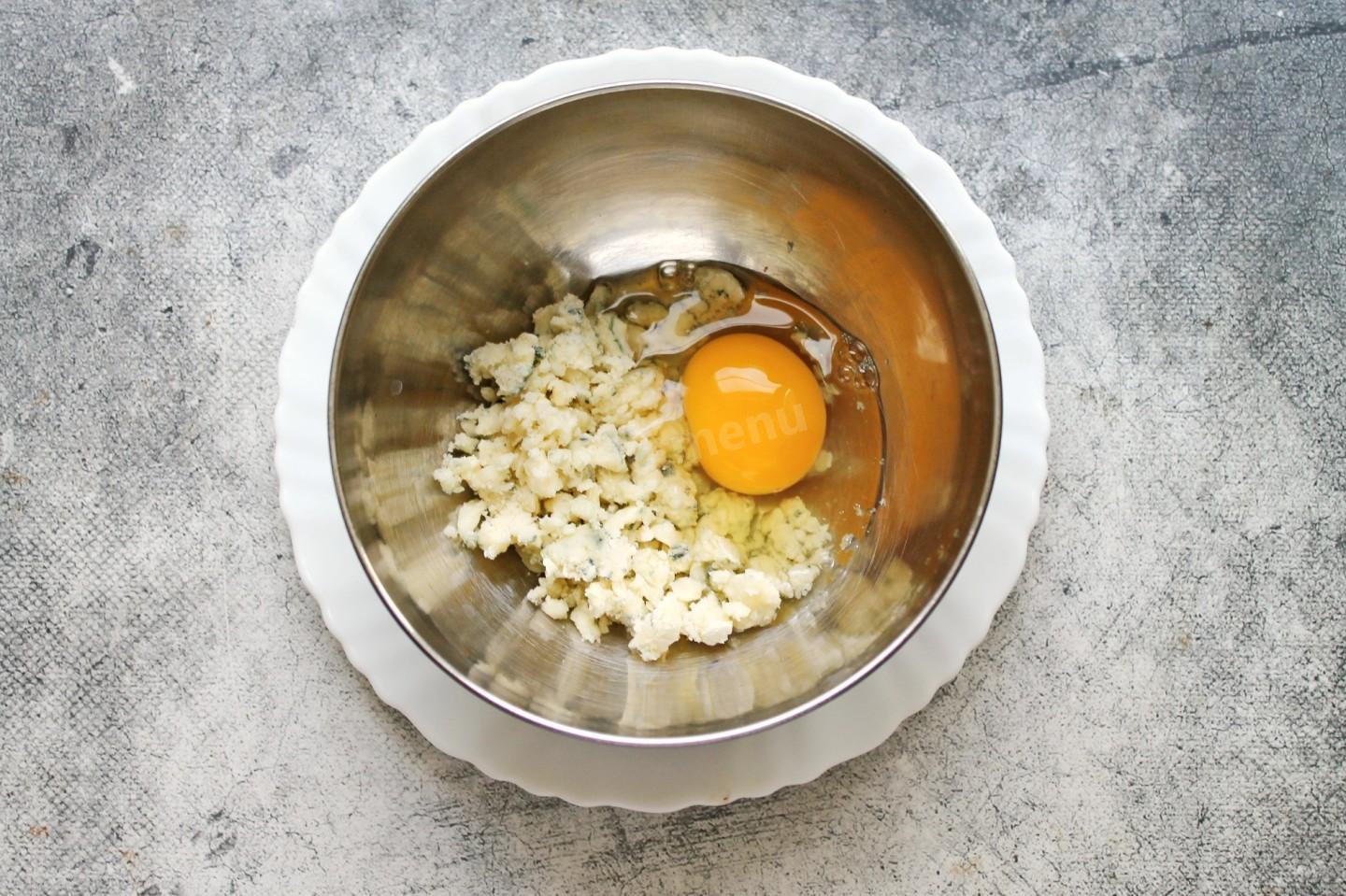 Для соуса в миску разбейте яйцо и раскрошите голубой сыр. Если он слишком плотный, натрите на средней терке. Вместо сыра с голубой плесенью можно взять моцареллу, твердый сыр, который хорошо плавится, или обычный плавленый сырок. О том, как заменять различные виды сыров, читайте в конце рецепта.