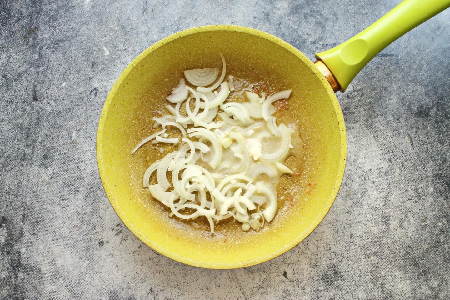 Репчатый лук порежьте тонкими полукольцами. Положите в сковороду после обжаривания рыбы сливочное масло и выложите репчатый лук. Обжаривайте его в течение около 5 минут, перемешивая.