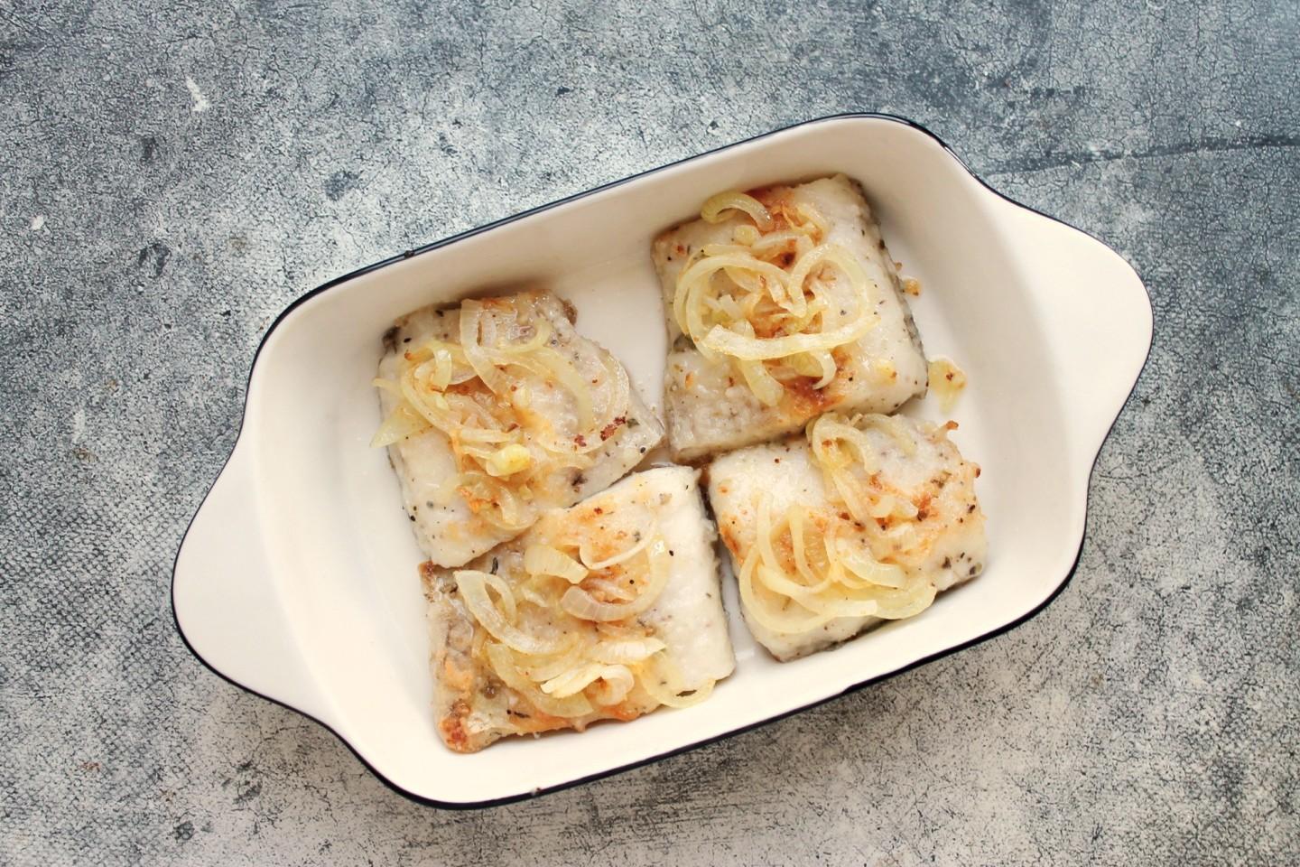 Обжаренный лук разложите сверху рыбы. Информацию о формах для запекания и чем они отличаются можно прочитать в статье под рецептом.
