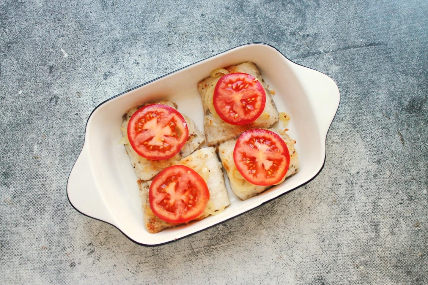 У помидора отрежьте с двух сторон концы и разрежьте на четыре колесика. Уложите помидору на рыбные порционные куски.