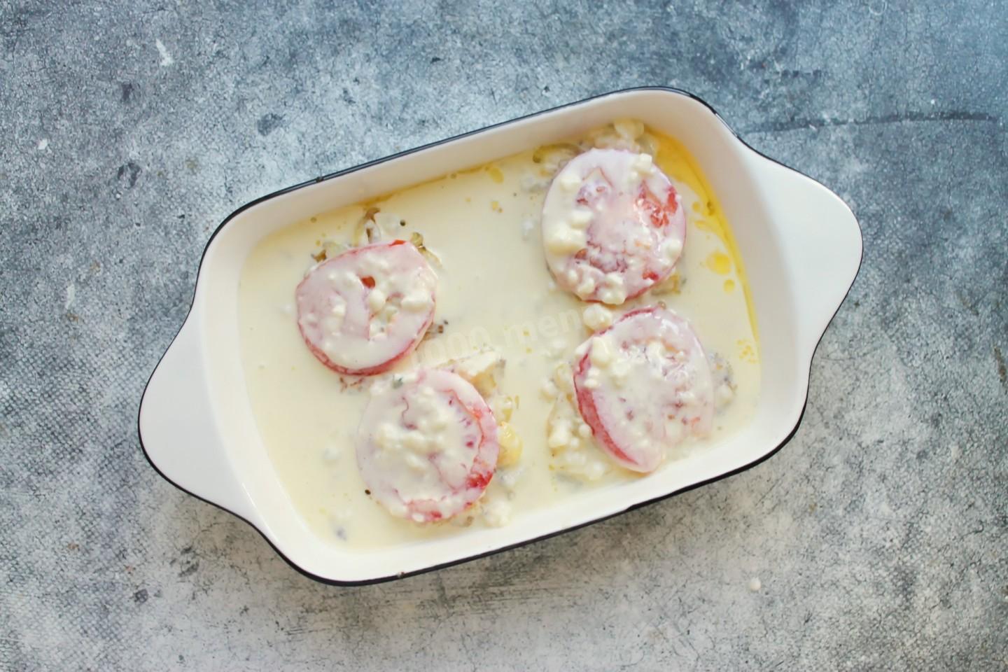 Залейте соусом рыбу с овощами, чтобы он попал под нее и пролил верх.