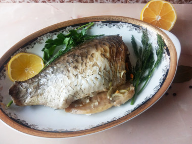 Готовлю карася в мультиварке на пару. Рыбу люблю во всех видах, приготовленная на пару рыбка нежнее и полезнее, чем при любом другом способе. Поэтому приступаю к приготовлению с особым удовольствием))). Подготовленную тушку карася я слегка натерла сверху солью с любимыми приправами. Рыбка оказалась с икрой, поэтому в брюшко я положила мелко нарезанную икру с репчатым луком, солью, перчиком. Если икру в рыбке не обнаружите, можно положить в брюшко немного нарезанного присоленного репчатого лука. Только не начиняйте брюшко плотно, чтобы начинка успела приготовиться. Сою я добавлять не стала, предпочитаю подавать ее к готовому блюду. Карасика запаковала в фольгу , уложила на решетку для готовки на пару. Тушка карася у меня была весом 540 грамм, поэтому я увеличила время приготовления до 40 минут. Через 40 минут аккуратно приоткрыла фольгу и попробовала лук из брюшка- готов! Значит можно подавать рыбку к столу. Вкуснейшая, нежная , ароматная рыбка получилась. Спасибо, Эля!