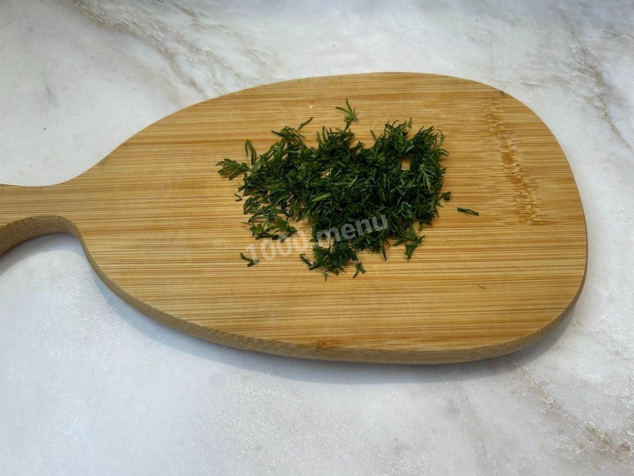 Укроп промойте, обсушите на бумажном полотенце, удалите жесткие стебли и мелко порубите ножом.