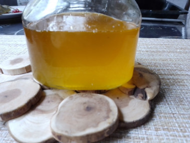Когда же стало видно дно кастрюли и масло стало красивого золотисто-медового цвета выключила комфорку. Перелила жидкую массу в заранее подготовленную баночку через несколько слоёв марли, закрыла крышкой. И всё!