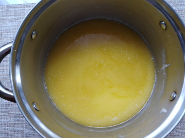 Взяла 500 г сливочного масла 72,5% жирности. Когда оно стало мягким порезала его на кусочки и переложила в кастрюлю в толстым дном. Поставила на небольшой огонь и начала ждать полного его растопления периодически помешивая.