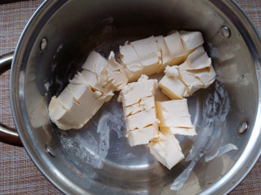 Для топления возьмите кастрюлю обязательно с толстым дном! Это важно, потому что масло в процессе варки может пригореть. Алюминий для этого рецепта не подходит. Лучшая кастрюля - чугунная, но можно делать и в стальной, если у нее толстое дно. Положите в кастрюлю масло и оставьте на пару часов при комнатной температуре. Оно должно стать мягким. Затем порежьте его на более мелкие куски.