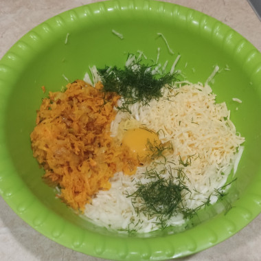 Капусту я нашинковала, добавила соль и помяла руками для сочности. Лук мелко порезала и обжарила,с натёртой на мелкой тёрке, на сковороде. К капусте добавила лук с морковью, натертый сыр, муку,яйцо, соль,перец. Перемешала, сформировала котлеты и обжарила на сковороде, с растительным маслом.