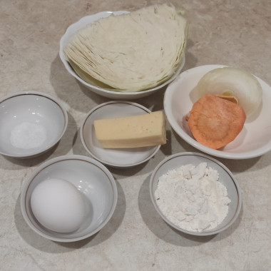 Капусту порубите ножом, лук мелко нарежьте, морковь измельчите в блендере. В разогретую сковороду налейте 1 ст.л. растительного масла, добавьте сливочного и обжарьте лук, добавьте морковь - жарьте до готовности, убавив нагрев до средне - малого.
