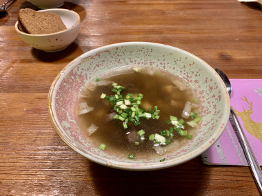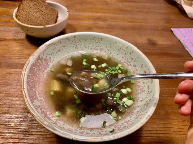 Такой суп был любимым блюдом во время осенних походов в лес — его готовили на костре в котелке.