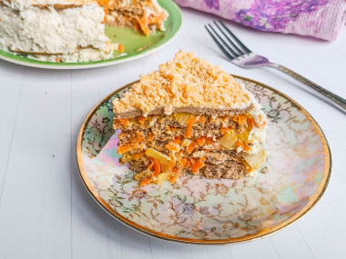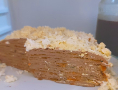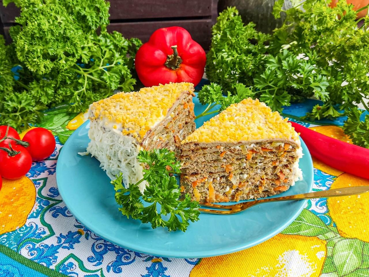 Обалденный торт! Очень вкусный. До этого делала - блинчики не получались. Поэтому рецепту все получилось! Съели быстрее чем успела сфоткать. Спасибо за рецепт печеночного торта с морковью и луком!
