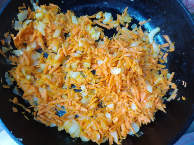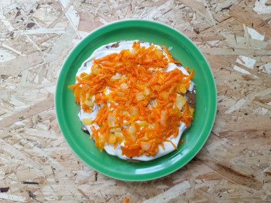 Обжаренные овощи сложите в тарелку. Разделите зажарку на такое количество частей, чтобы каждый блинчик, кроме верхнего, был равномерно покрыт ей. У меня получилось 10 коржей, поэтому овощную массу я разделила на 9 частей.