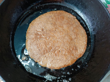 Через 1-2 минуты блин схватится и обретет коричнево-бежевый оттенок. Аккуратно лопаткой подденьте его и переверните. Столько же обжарьте его с другой стороны.