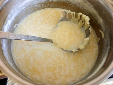 Доведите молоко до кипения и варите вермишель помешивая на медленном огне минут 7. Затем плиту отключите, накройте сотейник крышкой и дайте дойти вермишели до полной готовности под крышкой в течении примерно 5 минут.