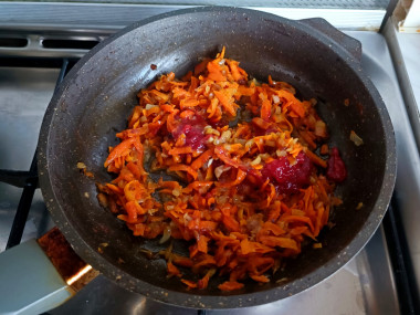 В кастрюлю налила воду, добавила нарезанный картофель и поставила на огонь. Для дополнительной сытности я решила добавить пшено, которое прекрасно впишется в общий вкус. Пока картофель и пшено варятся, на сковороде обжарила лук с морковкой до золотистого цвета. Через несколько минут добавила томатную пасту, и овощи начали томиться, наполняя кухню теплом и ароматом.