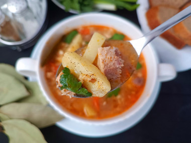 Готовый суп с консервированной горбушей и картошкой разлейте по тарелкам. Украсите свежей зеленью и подайте к столу. Приятного аппетита!