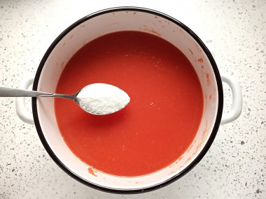 Емкость для варки выберите побольше, так как сок будет булькать, и из-за этого он может выплеснуться из маленького ковшика. В кастрюлю к томатному пюре добавьте соль. В этот же момент по желанию можно добавить черный молотый перец. Сок можно также приготовить без специй вовсе. А посолить и поперчить уже перед самым употреблением.