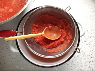 Чтобы томатный сок стал более однородным, протрите его через сито. Это позволит избавиться от мелких частичек кожицы и семян. Подготовленный томатный сок перелейте обратно в кастрюлю и снова прогрейте.