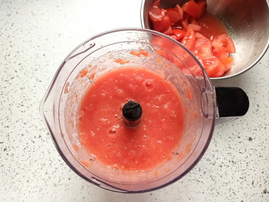 Переложите часть помидорных долек в чашу блендера и хорошо перебейте их до получения томатного пюре. Получившееся пюре перелейте в кастрюлю, а в блендер заложите новую порцию долек помидор, снова перебейте. Таким способом переработайте все помидоры.