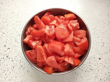 Помидоры промойте под водой, разрежьте пополам и удалите плодоножку вместе с серединой, то есть ту часть, где к помидору прикрепляется веточка и уходит стержнем внутрь томата. После удаления плодоножки нарежьте помидоры дольками.