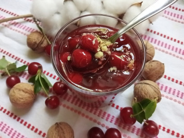 Уже много раз попадался мне на глаза этот рецепт вишни в вине, но мне не очень было понятно как это должно быть на вкус) Но недавно готовила соус на основе красного вина и бутылка так и осталась на столе. Решила, что это знак и стоит попробовать) Сделала все по инструкции, проварила, потом добавила разведенный крахмал. Крахмал у меня был картофельный. Сначала жидкость была мутной, белесой. Даже расстроилась, что не получилось. Но через пару минут масса стала прозрачной, насытилась мелкими пузырьками воздуха. И стала стремительно густеть! При непрерывном помешивании проварила ещё пару минут и оставила десерт остывать. После этого переложила его в стаканчик и убрала в холодильник. Перед подачей посыпала грецим орехом, натертым на крупной тёрке. Мне очень понравилась консистенция этого десерта, жидкость стала густой, тягучей, прозрачной. Вишенки в этой красоте выглядят невероятно аппетитно! Я не любитель красного вина, но моему мужу десерт пришёлся по вкусу) Он сказал, что на вкус сладко и терпко, вишневый вкус преобладает. Кстати попросил в следующий раз вынуть косточки из вишен) А мне очень понравился внешний вид!
