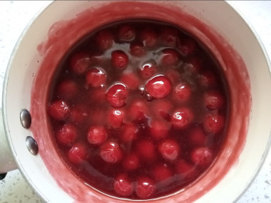 Одну столовую ложку вина оставьте в стакане, оно понадобится для растворения крахмала. Поставьте миску с вишней на средний огонь, дайте смеси закипеть, убавьте огонь до минимального и проварите ягоды в вине в течение 10 минут, постоянно помешивая ложкой, чтобы сироп не начал пригорать к дну посуды.
