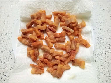 Готовые шкварки я выложила на бумажное полотенце, чтобы впитался лишний жир. Шкварки у меня получились хрустящими, вкусными, ароматными! Их можно присыпать солью и есть просто так. Но я добавила шкварки дрмашние в начинку для пирога. Отлично вышло!