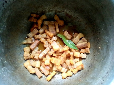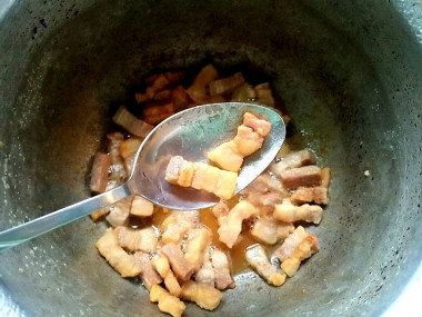 Я взяла грудинку - это сало с прослойками мяса. Брусочки сложила в казан и включила небольшой огонь. Сначала сало потихоньку становится прозрачным, а мясо слегка обжаривается. Главное, не прибавлять нагрев. Постепенно жир вытапливается и кусочки сала становятся меньше размером. Совсем в сухари превращать не нужно). Достаточно дожаться, чтобы они стали хрустящими, но чуть мягкими внутри.