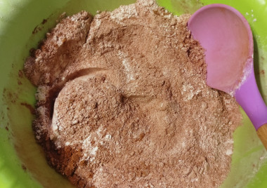 В отдельной миске соедините пшеничную муку, какао, сахар и соль. Муки у вас может уйти больше или меньше, чем у меня, поэтому часть муки отложите в сторону, будете добавлять ее потом частями, следя за консистенцией теста.