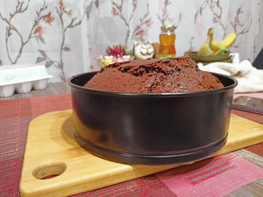 В смазанную сливочным маслом форму для выпекания вылейте тесто. По консистенции оно должно быть как очень густая сметана. У меня было кулинарное кольцо без дна, но тесто при выпекании не вытекло. Выпекайте корж в разогретой до 175°С духовке около 45-55 минут (ориентируйтесь по своей духовке!). Минут через 20-25 от начала выпекания, (обязательно после того, как корж перестанет расти!), начинайте проверять его готовность деревянной шпажкой каждые 5 минут.