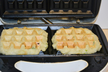 Электровафельницу предварительно разогрейте. Выложите немного картофельного теста и выпекайте 3-5 минут до золотистого цвета. Если вафли прилипают к поверхности вафельницы, можно перед выпеканием каждой вафли смазывать панели растительным маслом. На этом этапе вы можете сделать вафли из картофельного пюре более нежными или, наоборот, хрустящими, больше прожаренными.