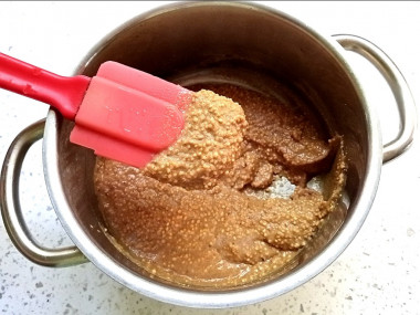 7. В получившуюся массу наливаем оливковое масло, выкладываем горчицу в зернах и отправляем на небольшой огонь, подогреваем при постоянном помешивании, пока масса не загустеет.