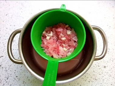 3. Чеснок очищаем, выдавливаем через пресс, отправляем вслед за луком.
