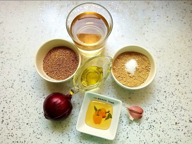 Все ингридиенты отмерила согласно рецепту, только уменьшила количество до 5 порций. Вино у меня сухое, но думаю, можно и более сладкие сорта использовать. Горчичный порошок взяла свежий, он более ароматный. Лук красный, он менее острый и на мой взгляд более вкусный.