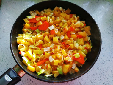 Добавьте в сковородку капусту с морковкой. Помешивая, обжарьте снова около пяти минут. Посолите по вкусу, пламя плиты убавьте до умеренного, сковородку накройте крышкой и оставьте таким образом до полной готовности всех компонентов. У меня ушло около 10-15 минут. Важно не передержать овощи на плите, иначе они превратятся в кашу.