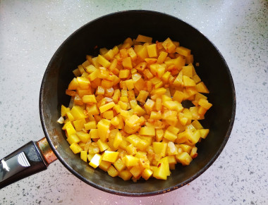 В сковородке с толстым дном разогрейте растительное масло без запаха. Отправьте картошку и лук обжариваться. На сильном огне готовьте, помешивая, около пяти минут (до тех пор, пока лук и бока картофеля станут слегка золотистыми).