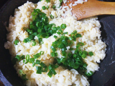 Интенсивно помешивайте лопаткой, чтобы яйцо равномерно распределилось среди риса и успело приготовится.