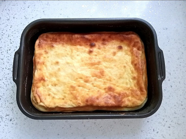 Выложите тесто в смазанную маслом форму. Пеките запеканку в разогретой до 170°С духовке около 35 минут. Учитывайте, что духовки у всех разные. Температура и время приготовления могут отличаться от указанных в рецепте. Во время выпечки запеканка быстро поднимется, но как только вытащите ее из духовки — тут же опустится. Запеканка сильно подрумянивается, можете накрыть ее фольгой. Готовую запеканку немного остудите и подавайте к столу. Приятного аппетита!