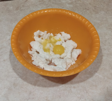 Возьмите большую миску, положите в нее творог, сливки, сахар, ванильный сахар и желтки.