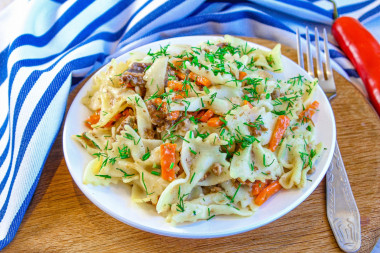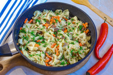 Нужно было приготовить быстрый ужин, для этого выбрала рецепт рожков с тушёнкой. Тушёнку взяла из говядины, овощи добавила согласно рецепту, только не стала ложить в блюдо соус Чили, сильно острое в нашей семье не очень любят. Макароны сварила в виде бабочек, из зелени выбрала укроп, которым посыпала уже готовое блюдо перед подачей. Ужин получился вкусным и сытным, всем советую!