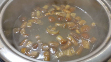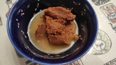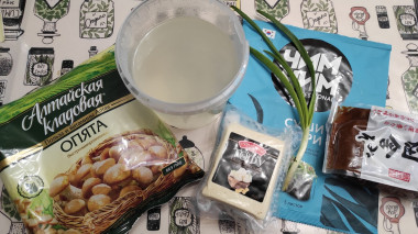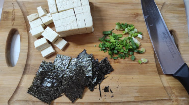 Тофу для супа у нас должно быть плотненьким, это важно. Мы сливаем лишнюю жидкость, слегка подсушиваем его салфеткой и нарезаем ровными кубиками по два с половиной сантиметра в ширину. Ставим бульон даши на плиту, доводим до кипения на медленном огне и всыпаем мелко нарезанные грибы. Продолжаем варить минуты две-три. Теперь из нескольких ложек бульона и коричневую приправу мисо делаем однородную смесь и вливаем в суп. Кладем нарезанный мелко зеленый лук и тофу. Наш суп сейчас не должен закипать, поэтому следим за ним очень внимательно. Как только он будет готов закипеть, тут же снимаем кастрюлю с плиты. Подавать суп мисо нужно горячим.